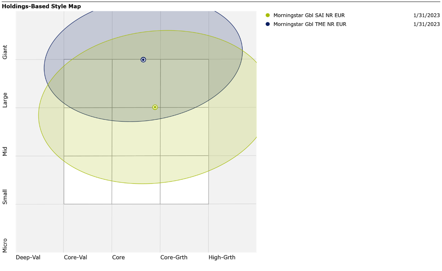 Of the 8,764 companies in the global equities parent index (the Morningstar Global All Cap Target Market Exposure Index), fewer than 5% made their way into the SAI Index as of January 2023. When aggregated to the portfolio level, the index skews far smaller and a bit more growth-leaning that the broad equities universe—as seen in the visual below from Morningstar Direct.